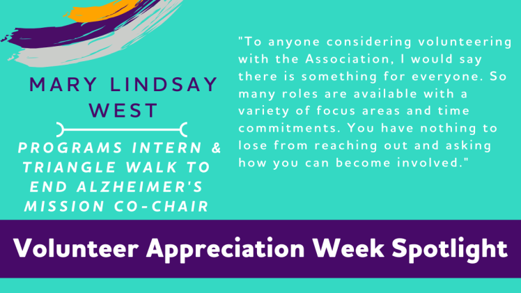 During my time with the Alzheimer’s Association, I have been an intern with the Programs Team as well as a Community Educator. Now I continue to be involved as a Co-Chair of the Mission Subcommittee for Walk to End Alzheimer’s – Triangle.