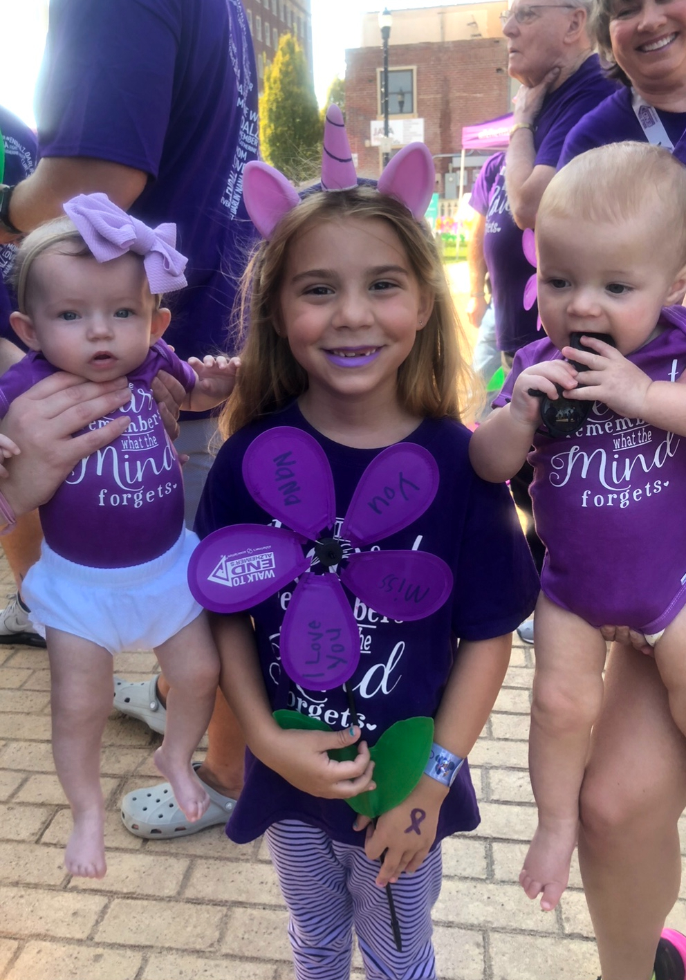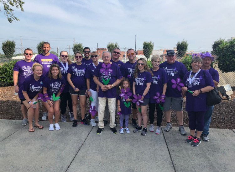 Last year, Cindy’s walk experience added a new layer of meaning as her father in law was recently diagnosed with Lewy body dementia, a type of progressive dementia that leads to a decline in thinking, reasoning and independent function because of abnormal microscopic deposits that damage brain cells over time. This new fight has renewed her family’s fundraising efforts. Regarding her family history with the disease, she admits that “It is very difficult to already know what is down the road. We never want anyone to go through this pain.” Cindy hopes for a day that dementia is talked about in the past tense, noting that her goodbyes happen a long time before her loved ones pass. This diagnosis adds both yellow flowers (as caregivers) and a blue flower (someone with dementia) to their family garden.
