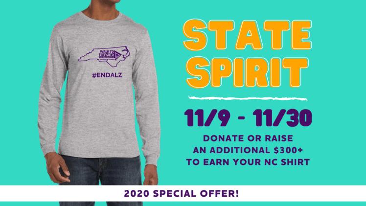 To encourage our on-going momentum, we are excited to announce a new challenge! Today through November 30, anyone who raises or donates an additional $300 for a local walk will earn an exclusive N.C. Walk to End Alzheimer’s long sleeve t-shirt. There’s no better way to show your North Carolina pride and your commitment to fight Alzheimer’s and all other dementia.