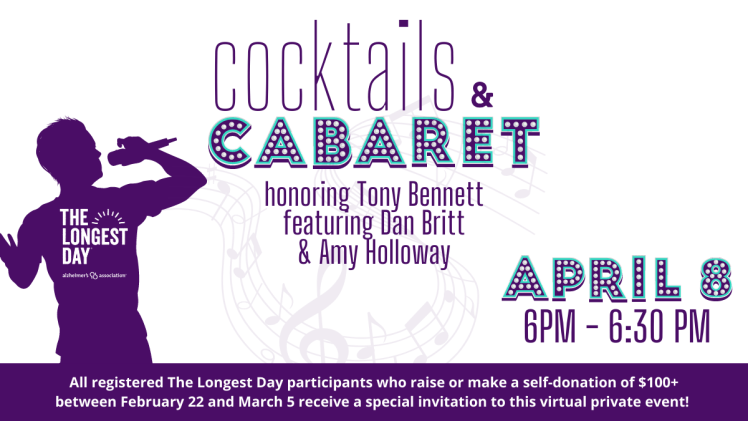 Celebrating the marvelous voice and songs of Tony Bennett who bravely announced he is living with Alzheimer’s, the Alzheimer’s Association chapters across North Carolina, South Carolina, and Georgia are hosting a special virtual event exclusively for registered participants of The Longest Day. Raise or self-donate $100+ from Feb. 22 through Mar. 5 in order to earn your ticket to this virtual concert that is sure to make you “Smile” and see “Orange Colored Skies” as you relax with a drink of choice and enjoy some of your favorite Tony Bennett tunes.