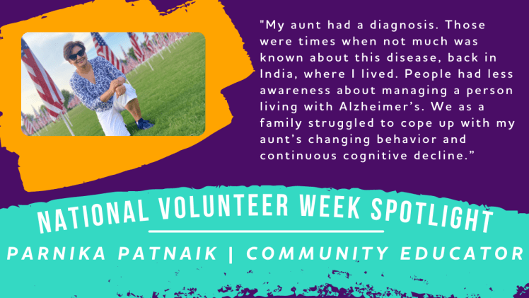 In 2015, when I came to the United States and began volunteering at a nearby assisted living and memory care facility, my engagement with the memory care residents reignited the desire to learn more about Alzheimer’s. One day, while browsing the internet for resources on managing Alzheimer’s disease, I landed on the homepage of the Alzheimer’s Association website and found it highly informative and enlightening. I read through the resources and began exploring their volunteer program and applied for the Community Educator role online. The Alzheimer’s Association considered my application and reached out to me. After some sessions of training, I was given this wonderful opportunity and platform to work as a volunteer Community Educator.