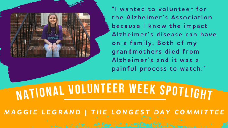 I wanted to volunteer for the Alzheimer’s Association because I know the impact Alzheimer’s disease can have on a family. Both of my grandmothers died from Alzheimer’s and it was a painful process to watch. Being a volunteer with the Alzheimer’s Association has given me purpose to help individuals living with dementia and families in their time of need.