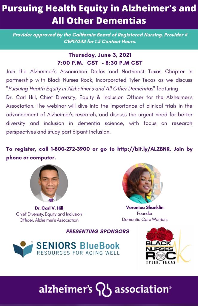 North Carolina residents are invited to join our sister chapter, the Alzheimer’s Association, Dallas and Northeast Texas Chapter, in partnership with Black Nurses Rock, Incorporated Tyler Texas as we discuss “Pursuing Health Equity in Alzheimer’s and All Other Dementias” featuring Dr. Carl Hill, Chief Diversity, Equity & Inclusion Officer for the Alzheimer’s Association. The webinar will take place on June 3 from 8:00-9:30 EST and will dive into the importance of clinical trials in the advancement of Alzheimer’s research, and discuss the urgent need for better diversity and inclusion in dementia science, with focus on research perspectives and study participant inclusion.
