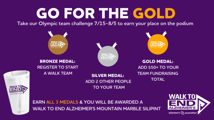 The 2020 Summer Olympics are getting ready to start later this month in Tokyo, but now is your chance to GO FOR GOLD. Register for one the Walk to End Alzheimer’s events taking place across North Carolina this fall. From July 15 through August 5, with three easy actions as a Walk Team captain, you can earn your gold medal.