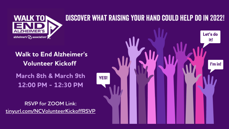 Learn more about how best to utilize your skills by joining us for one of our two virtual North Carolina Volunteer Kickoff Parties! In addition to learning more about our Planning Committee, also meet other individuals who share your passion. There are lots of ways to use your interests and skills to advance the cause — and have fun doing it. Hear from veteran committee members and learn how you can expand your role in the fight against Alzheimer’s disease. It won’t be a party without you!