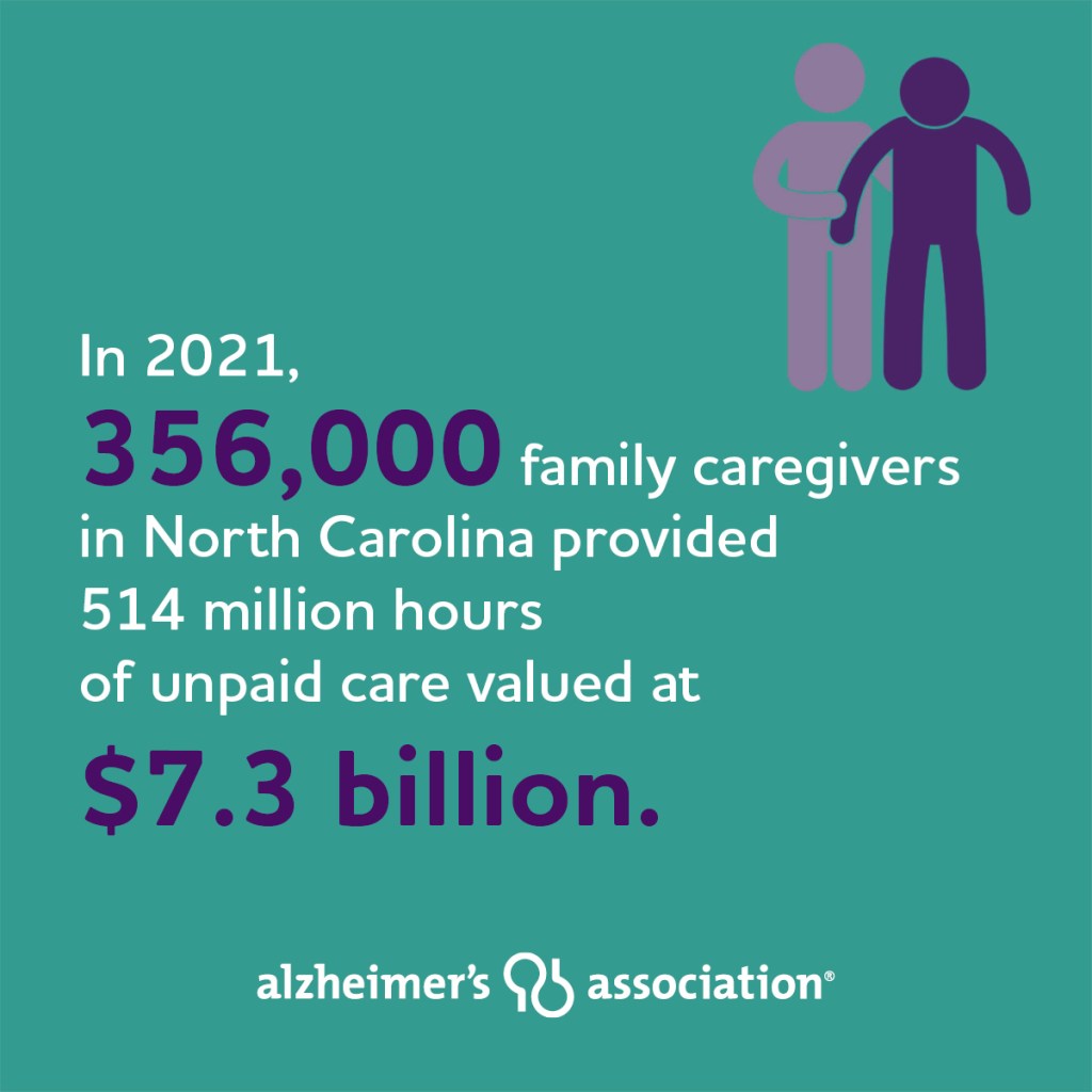 - In North Carolina, 356,000 caregivers provided a total of 514 million hours of unpaid care, valued at a total of $7.3 billion.