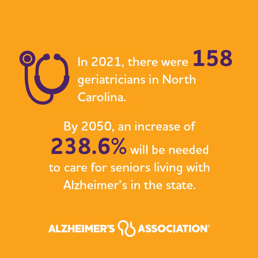 - In 2021, there were only 158 geriatricians in North Carolina. By 2050, 535 geriatricians will be needed to care for residents across the state living with Alzheimer’s dementia.