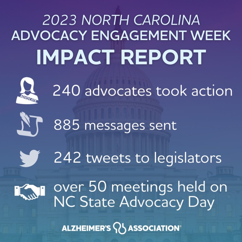 To marry state and federal efforts, North Carolina also held an Advocacy Engagement Week from March 12-18. During that week, advocates across North Carolina came together to raise their voices for key federal and state Alzheimer’s priorities. There were 240 advocates who took action resulting in 885 messages delivered to legislators, 242 tweets tagging representatives and over 50 meetings with legislators held on NC State Advocacy Day.
