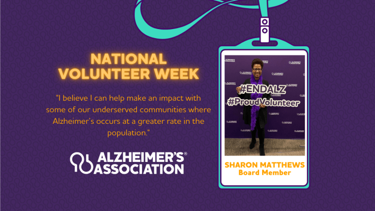 Sharing my “why.” I find that almost every time I share that I’m a member of the Alzheimer’s Association Board, someone responds with their Alzheimer’s or dementia story. I believe I can help make an impact and more connections with some of our underserved communities where Alzheimer’s occurs at a greater rate in the population. Knowledge of resources to support individuals and family members who are on this journey can be life-changing.