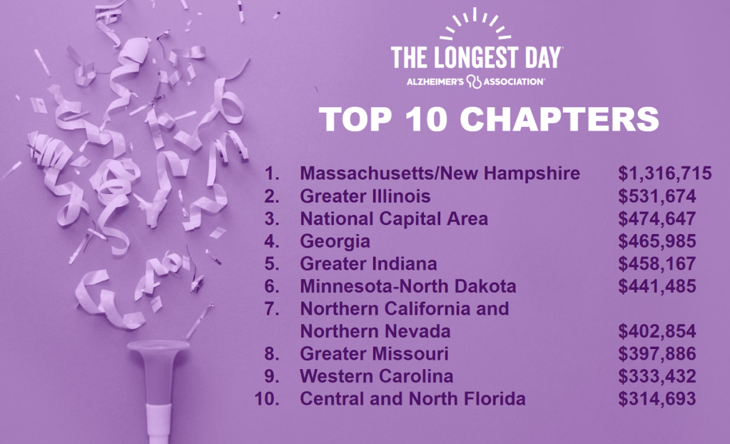 The Alzheimer’s Association – Western Carolina Chapter has earned the No. 9 spot in the nation for the Alzheimer’s Association 2025 Top Fundraising Chapters for The Longest Day (now known as Do What You Love to End ALZ ) AND No. 3 nationally for combined fundraising with the Eastern North Carolina Chapter.